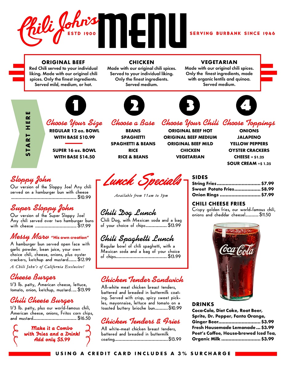 Located in the heart of Burbank, California, Chili John’s has been a cherished spot for chili lovers since 1946. As one of the city’s most iconic eateries, this historic parlor blends tradition with bold flavors to create an unforgettable dining experience. The classic diner setting, paired with the rich aroma of simmering chili, offers a nostalgic escape. Menu highlights include the hearty Beef Chili Bowl, the savory Messy Marv , and the indulgent Chili Cheese Dog.